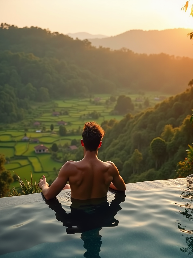 model in swim shorts lounging on edge of infinity pool overlooking jungle and rice terraces in Ubud, golden hour lighting
