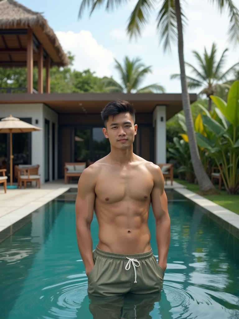 model in swim shorts relaxing in private luxury villa pool in Canggu, with modern tropical architecture and palm trees