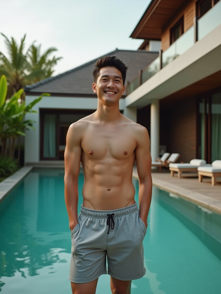model in swim shorts relaxing in private luxury villa pool in Canggu, with modern tropical architecture and palm trees