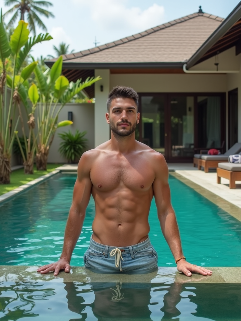 model in swim shorts relaxing in private luxury villa pool in Canggu, with modern tropical architecture and palm trees