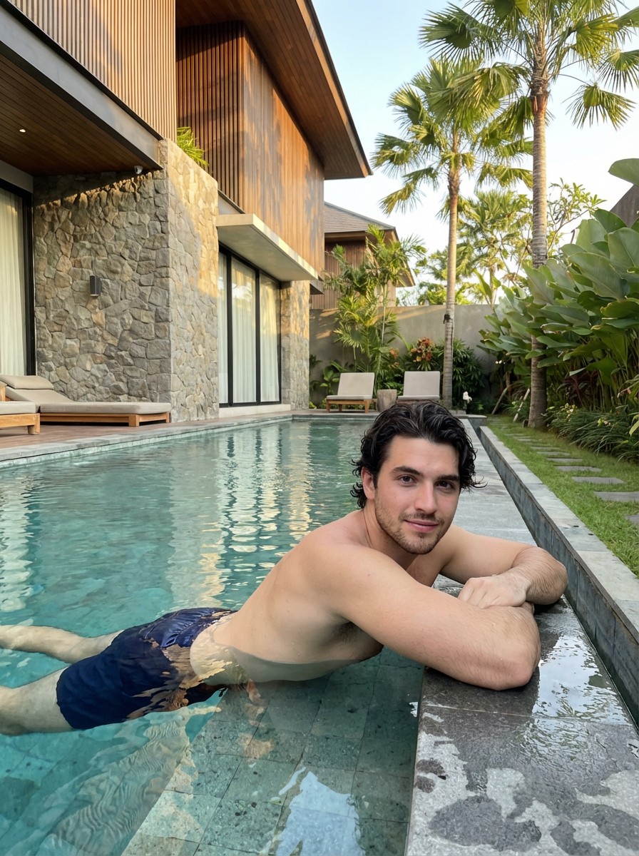 model in swim shorts relaxing in private modern luxury design villa pool in Canggu, with modern tropical architecture and palm trees