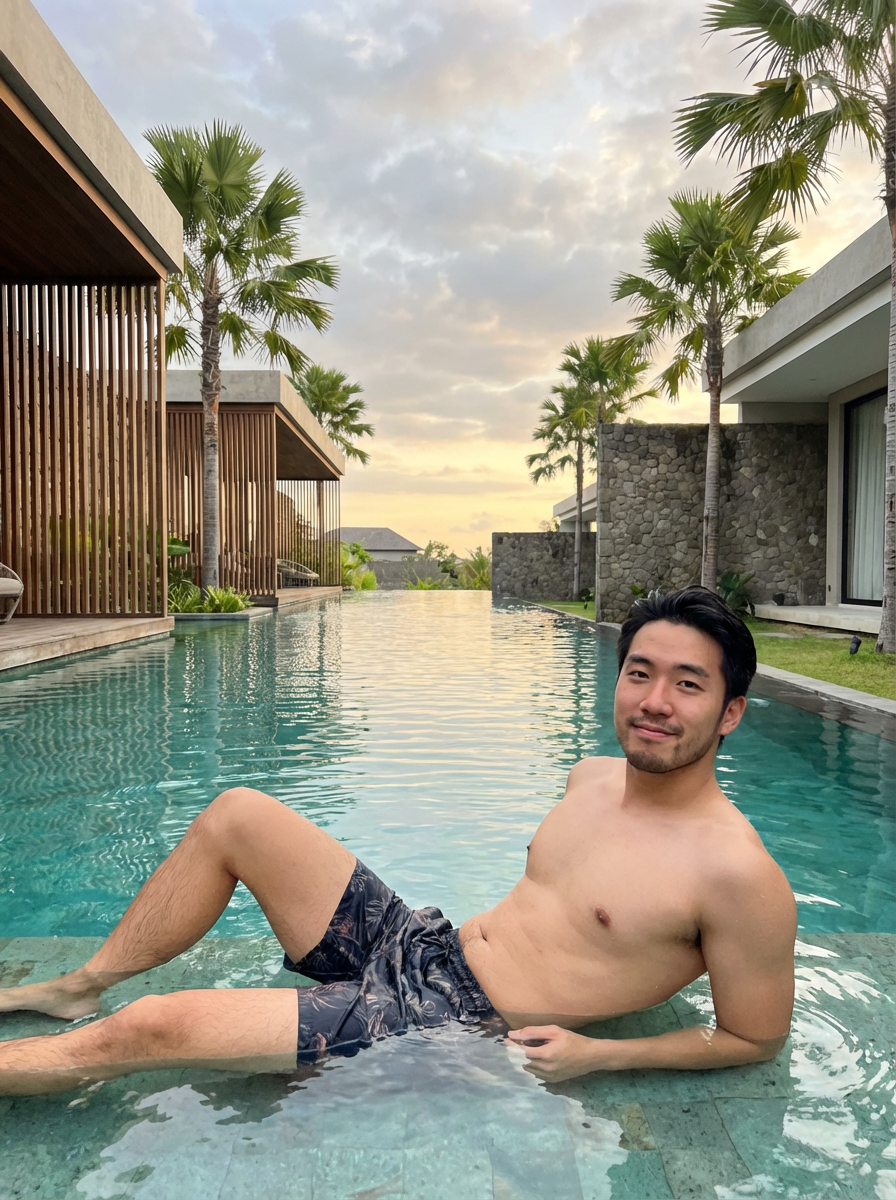 model in swim shorts relaxing in private modern luxury design villa pool in Canggu, with modern tropical architecture and palm trees