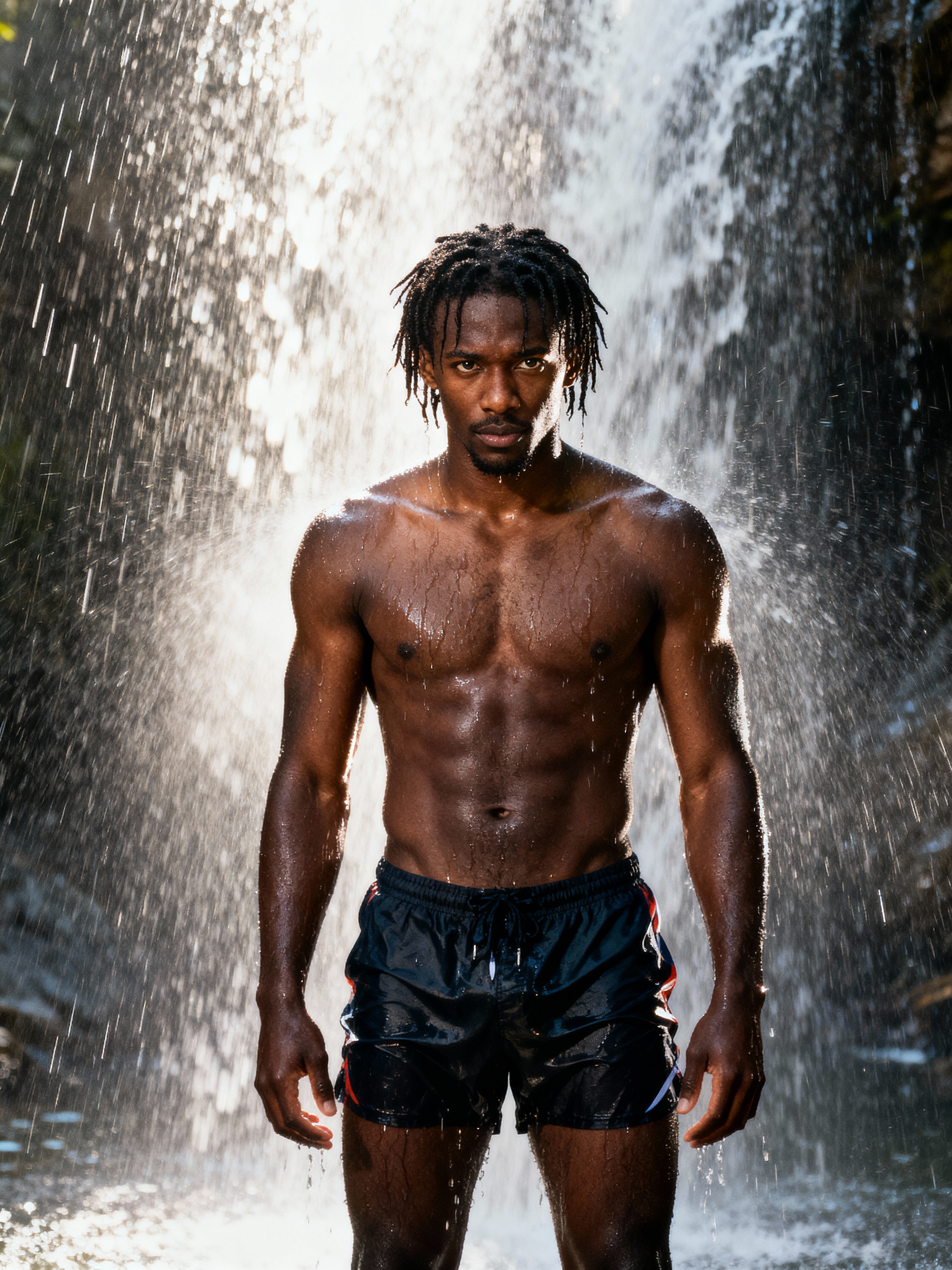 model in swim shorts under a waterfall, wet hair