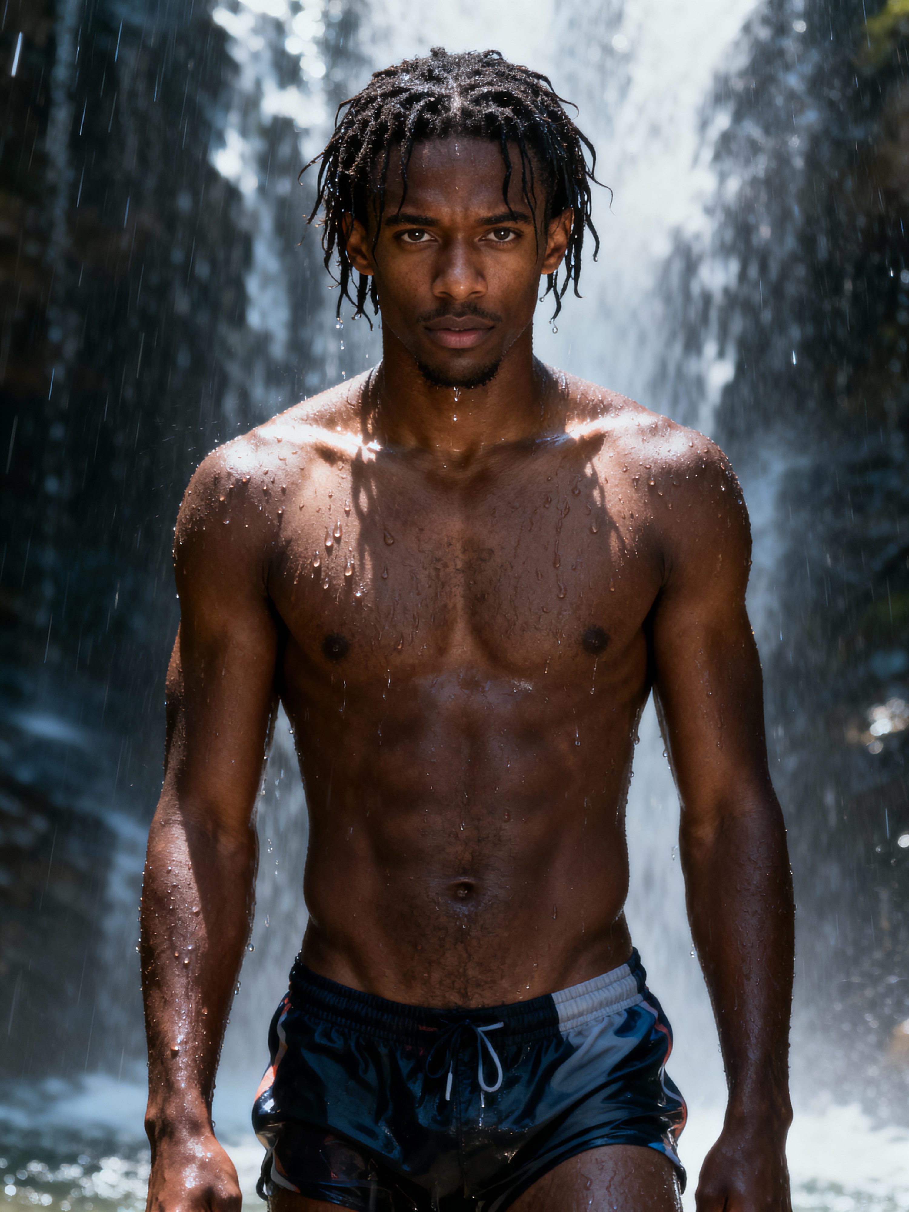 model in swim shorts under a waterfall, wet hair