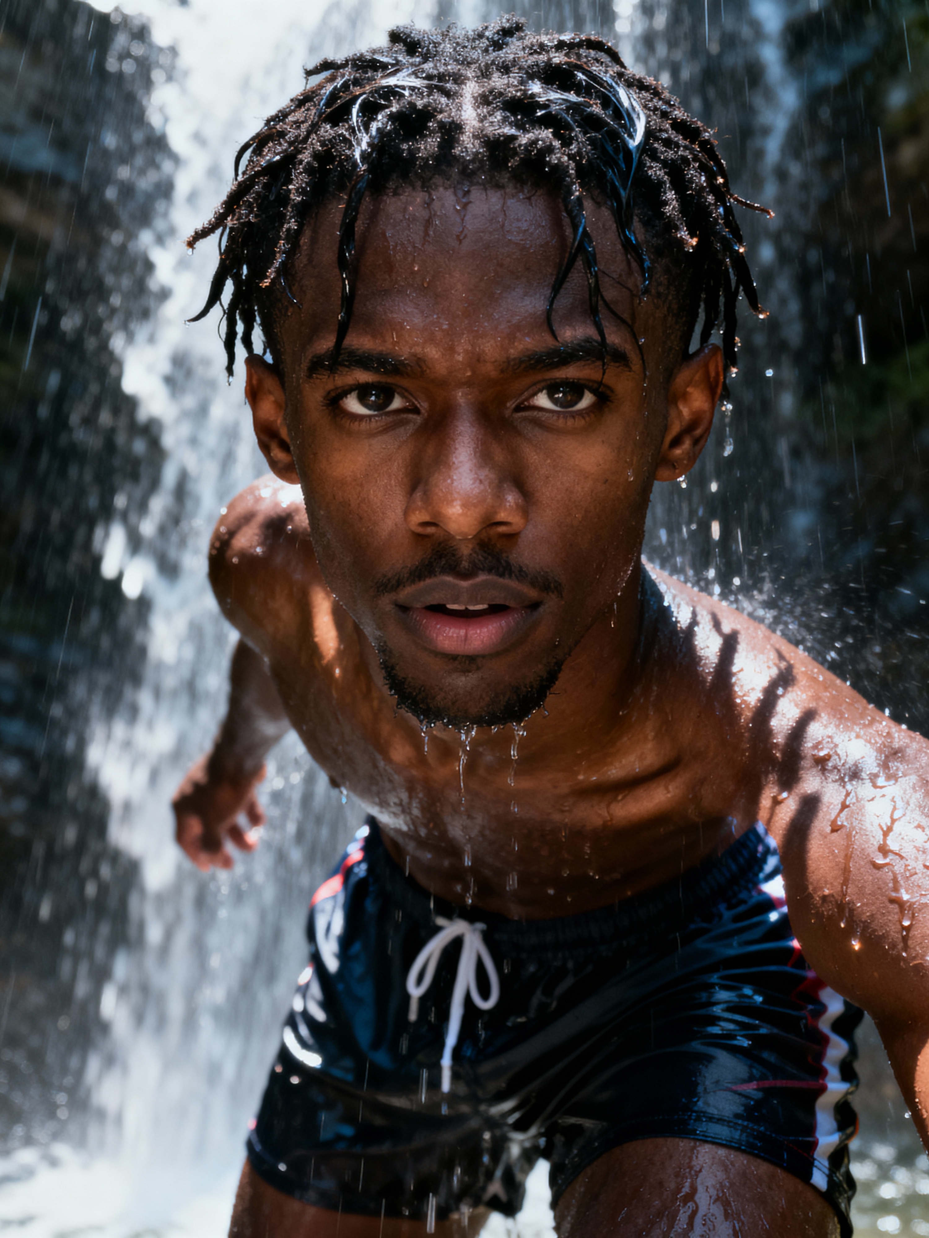 model in swim shorts under a waterfall, wet hair
