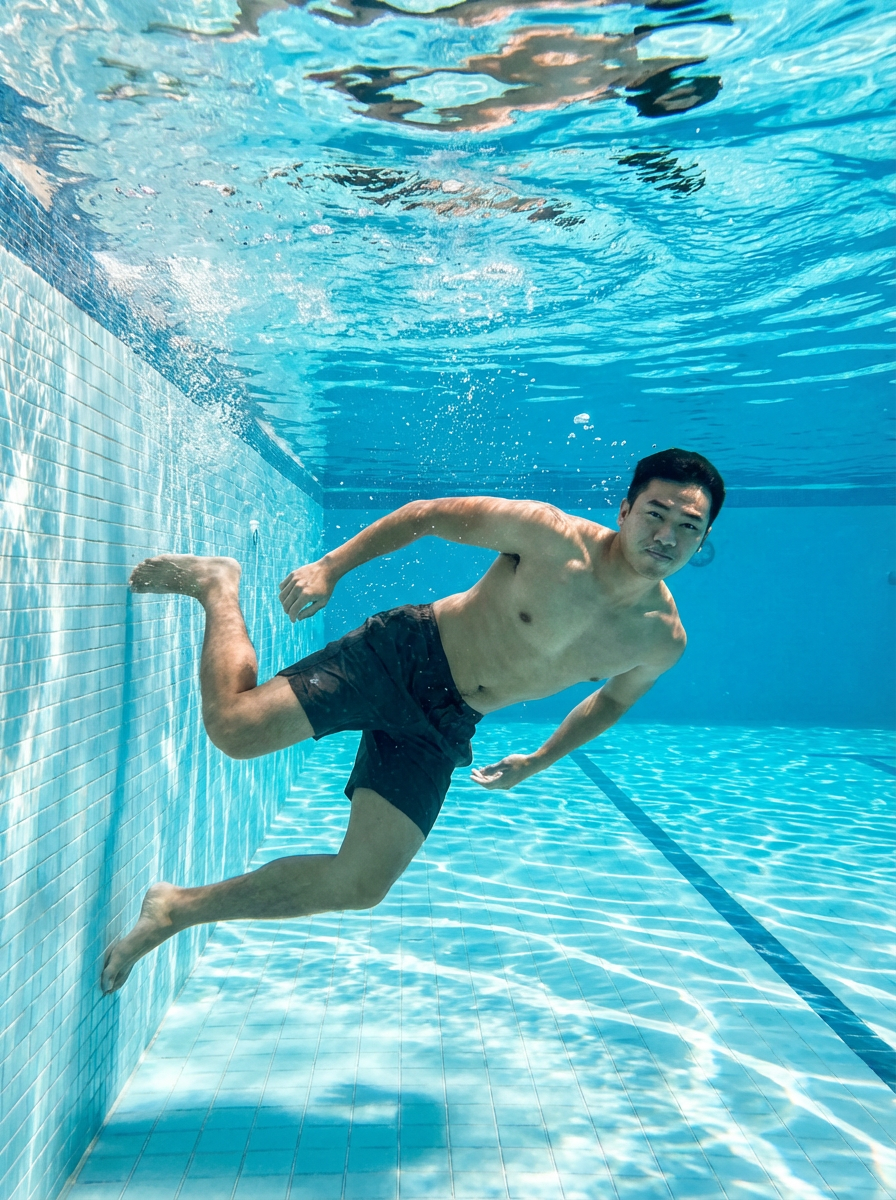 model in swim shorts underwater, showcasing athletic ability