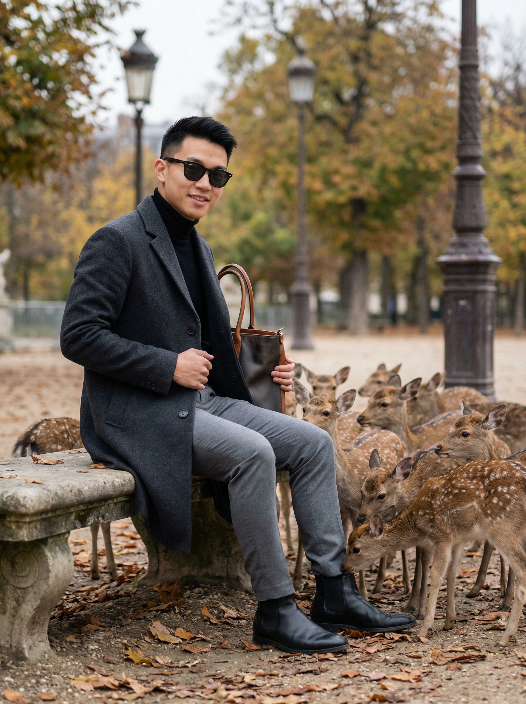 model in tailored long wool overcoat over a turtleneck, slim trousers, Chelsea boots, dark sunglasses, leather tote sitting on a chic stone bench in a parisian autumn park with fallen leaves, calm confident pose, 15 adorable baby deer with spotted coats gathered around the model and nuzzling their legs, ultra-photorealistic viral street-style editorial, soft overcast daylight, candid paparazzi vibe, 35mm, shallow depth of field