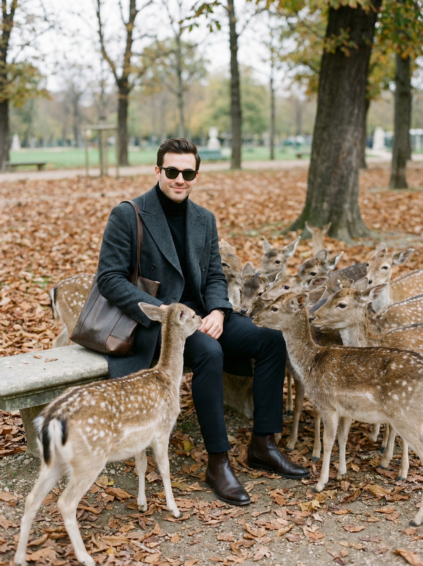 model in tailored long wool overcoat over a turtleneck, slim trousers, Chelsea boots, dark sunglasses, leather tote sitting on a chic stone bench in a parisian autumn park with fallen leaves, calm confident pose, 15 adorable baby deer with spotted coats gathered around the model and nuzzling their legs, ultra-photorealistic viral street-style editorial, soft overcast daylight, candid paparazzi vibe, 35mm, shallow depth of field