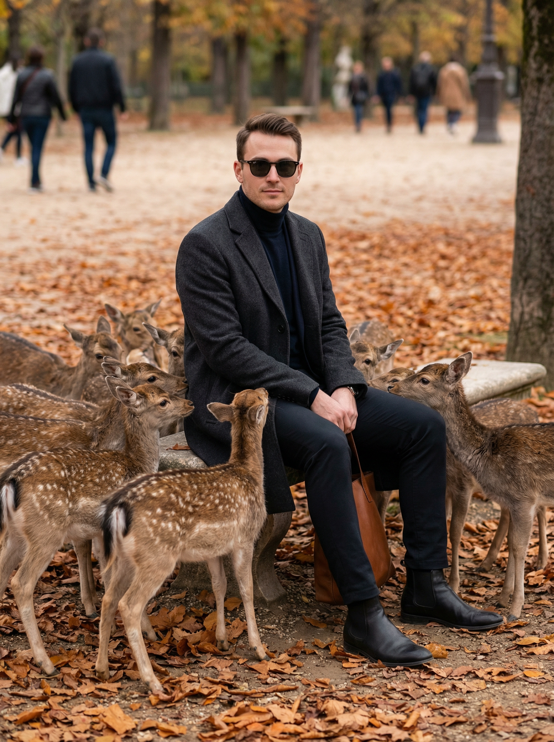 model in tailored long wool overcoat over a turtleneck, slim trousers, Chelsea boots, dark sunglasses, leather tote sitting on a chic stone bench in a parisian autumn park with fallen leaves, calm confident pose, 15 adorable baby deer with spotted coats gathered around the model and nuzzling their legs, ultra-photorealistic viral street-style editorial, soft overcast daylight, candid paparazzi vibe, 35mm, shallow depth of field