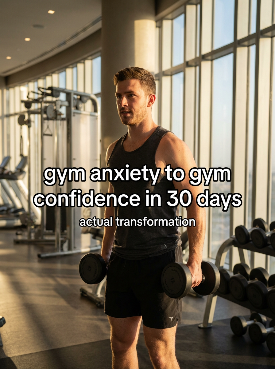 model in tank top and athletic shorts at luxury gym, golden hour lighting streaming through floor-to-ceiling windows, modern equipment in background, confident pose mid-workout. TikTok text overlay: "gym anxiety to gym confidence in 30 days" smaller text: "(actual transformation)", do not show tiktok interface