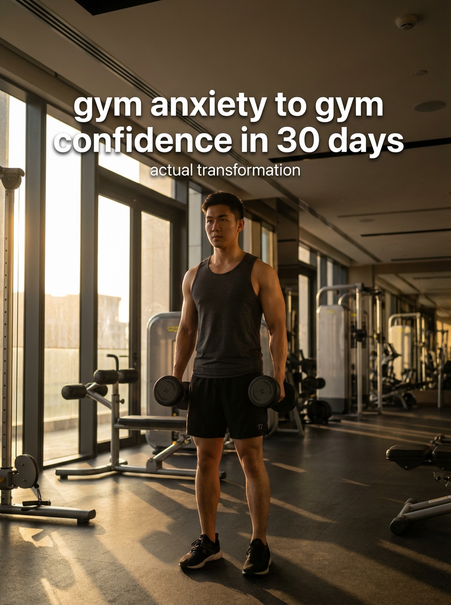 model in tank top and athletic shorts at luxury gym, golden hour lighting streaming through floor-to-ceiling windows, modern equipment in background, confident pose mid-workout. TikTok text overlay: "gym anxiety to gym confidence in 30 days" smaller text: "(actual transformation)", do not show tiktok interface