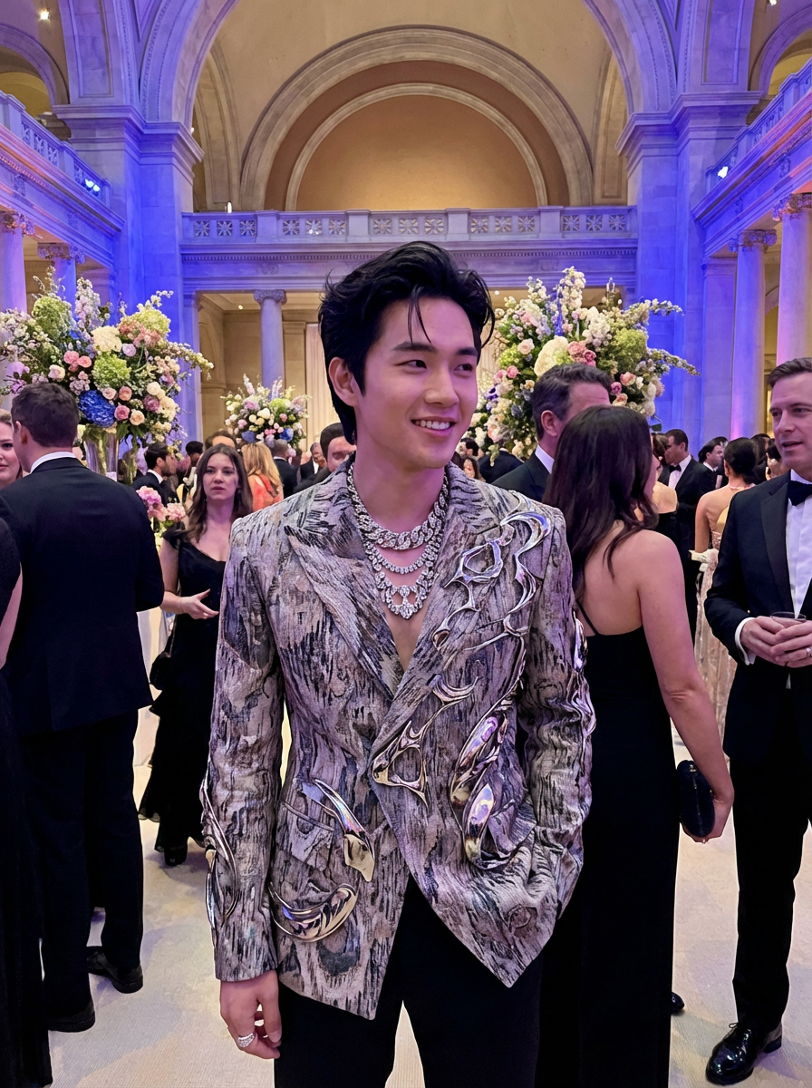 model in the Met Museum's grand hall transformed for the gala, wearing an artistic interpretation of formal wear with bold accessories, surrounded by spectacular themed decorations and lighting
