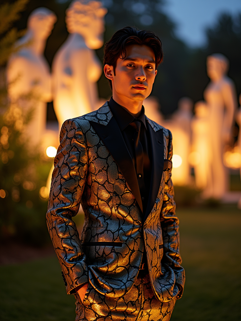 model in the museum's sculpture garden illuminated for the Met Gala, wearing an artistic suit with botanical motifs, dramatic nighttime lighting and event decorations