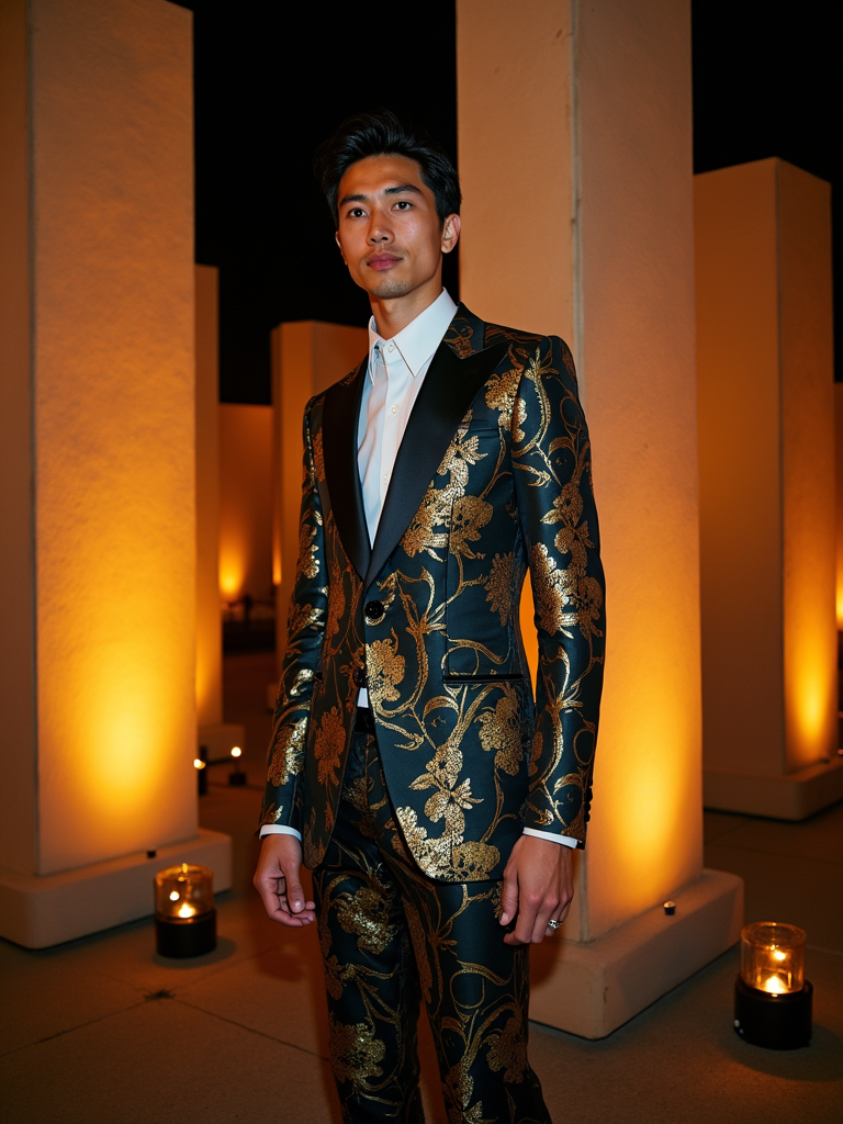 model in the museum's sculpture garden illuminated for the Met Gala, wearing an artistic suit with botanical motifs, dramatic nighttime lighting and event decorations