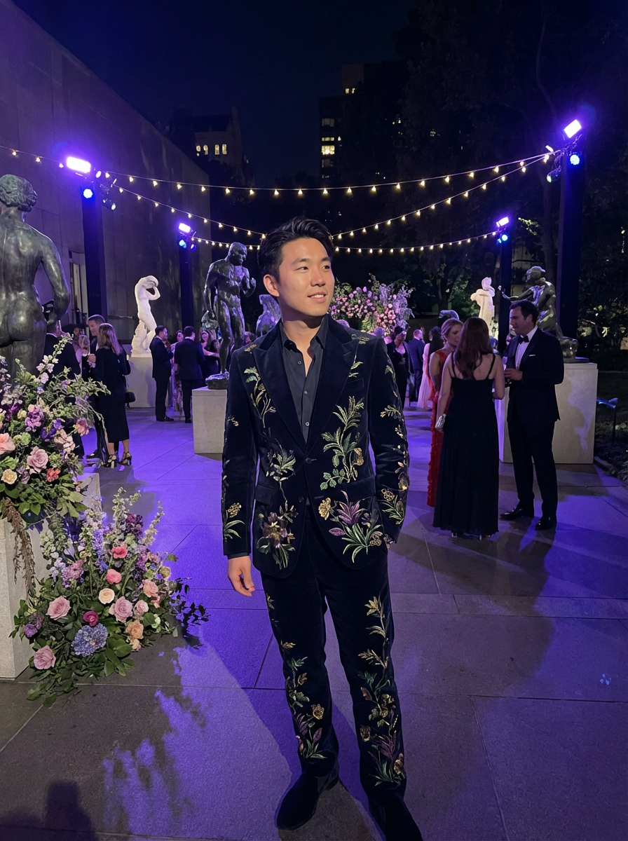 model in the museum's sculpture garden illuminated for the Met Gala, wearing an artistic suit with botanical motifs, dramatic nighttime lighting and event decorations