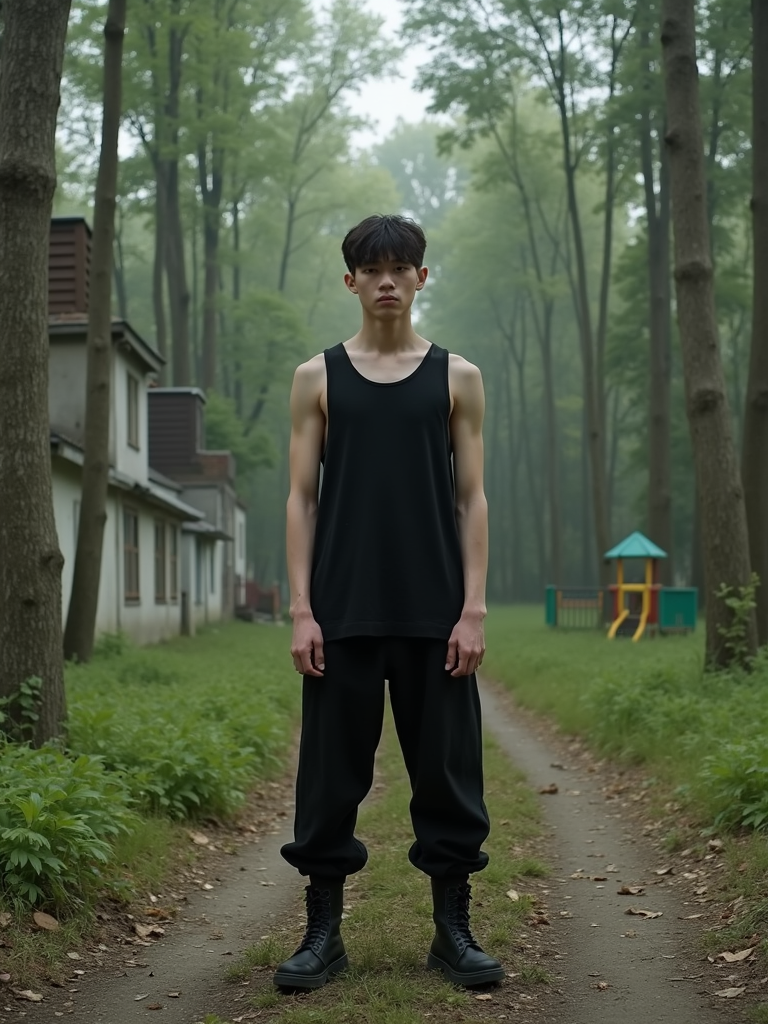 model in the overgrown Pripyat forest, trees towering over crumbling buildings and abandoned playgrounds in the background. wearing black boots and black pants and black tank top.