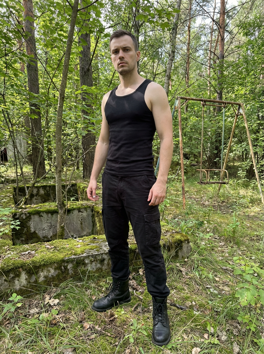 model in the overgrown Pripyat forest, trees towering over crumbling buildings and abandoned playgrounds in the background. wearing black boots and black pants and black tank top.