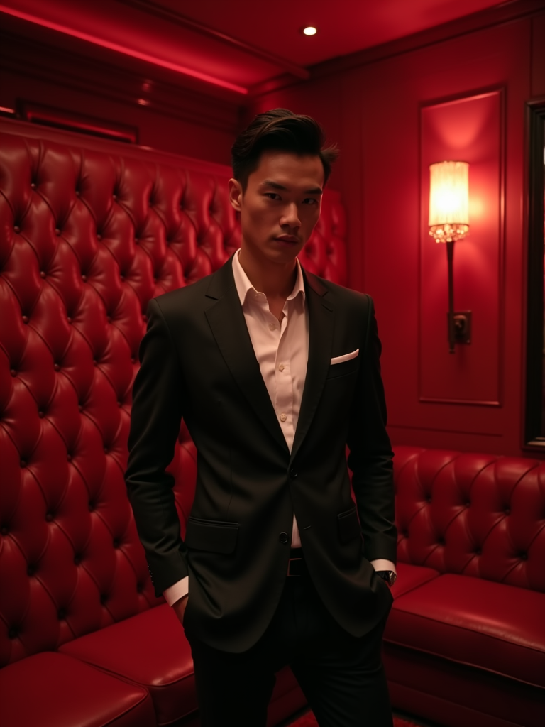 model in the spacious luxurious VIP section of a nightclub with red tufted leather couches. at night. the model wears a sharp suit or stylish blazer with dress pants, reflecting a high-class and fashionable appearance in the exclusive environment.
