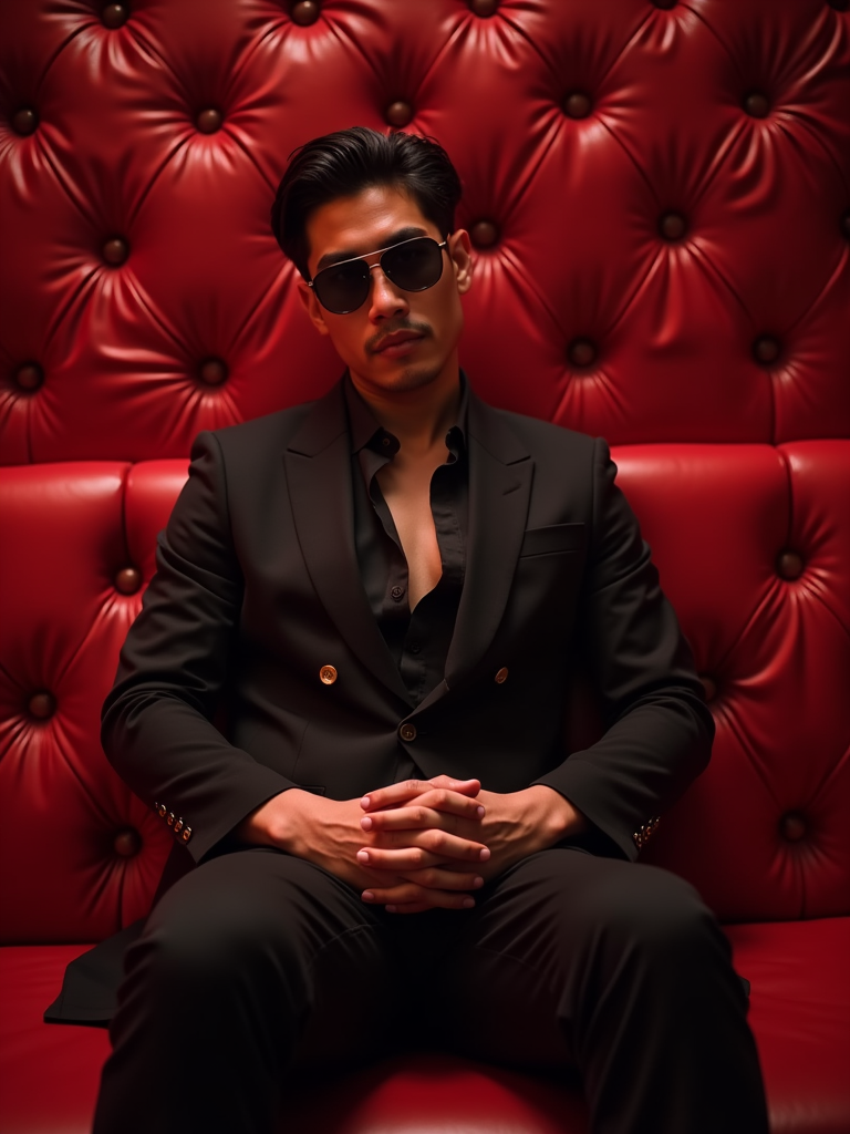 model in the spacious luxurious VIP section of a nightclub with red tufted leather couches. at night. the model wears a sharp suit or stylish blazer with dress pants, reflecting a high-class and fashionable appearance in the exclusive environment.