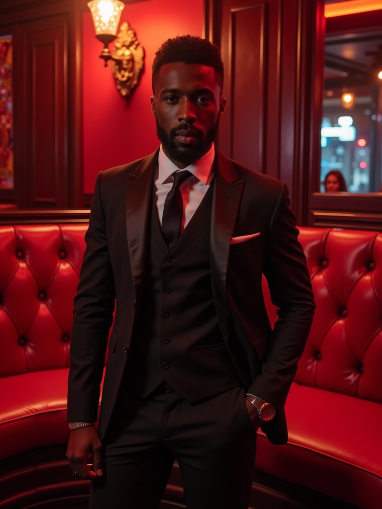 model in the spacious luxurious VIP section of a nightclub with red tufted leather couches. at night. the model wears a sharp suit or stylish blazer with dress pants, reflecting a high-class and fashionable appearance in the exclusive environment.