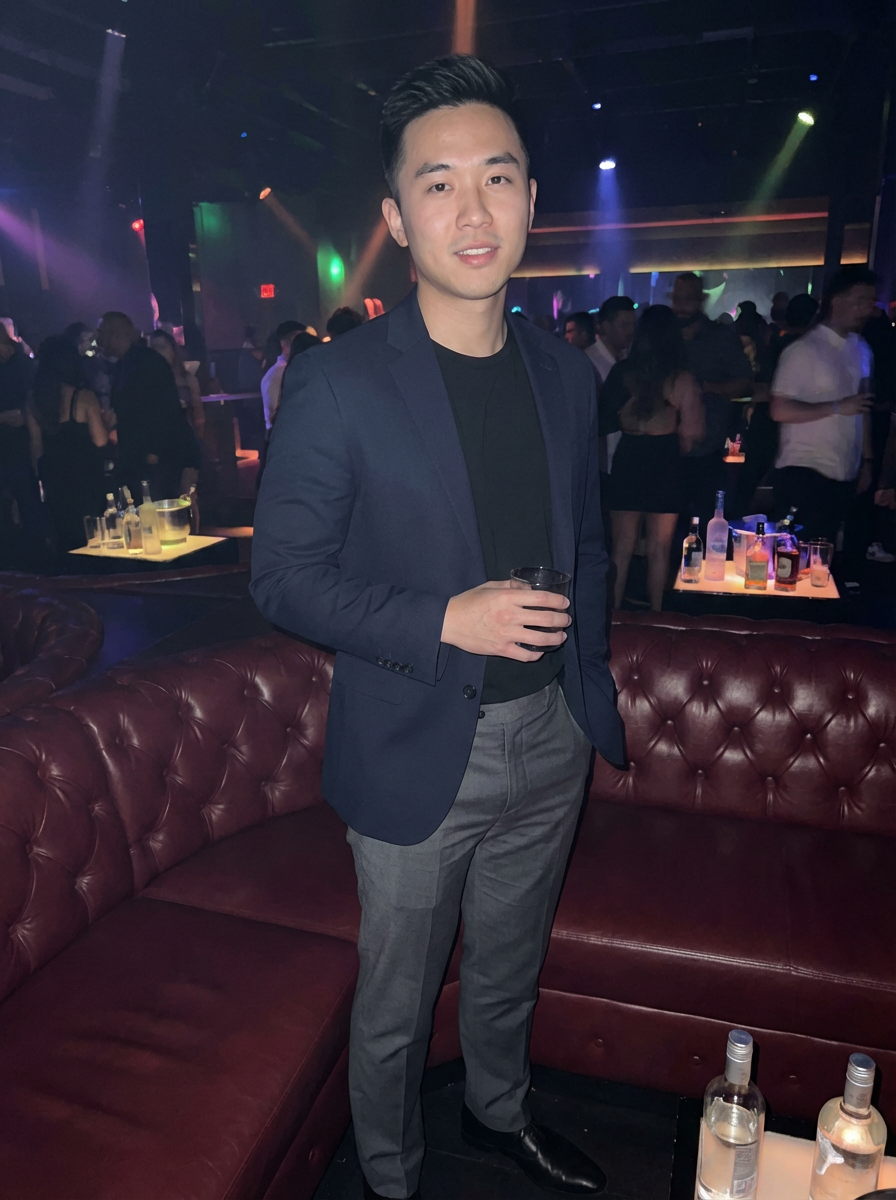 model in the spacious luxurious VIP section of a nightclub with red tufted leather couches. at night. the model wears a sharp suit or stylish blazer with dress pant