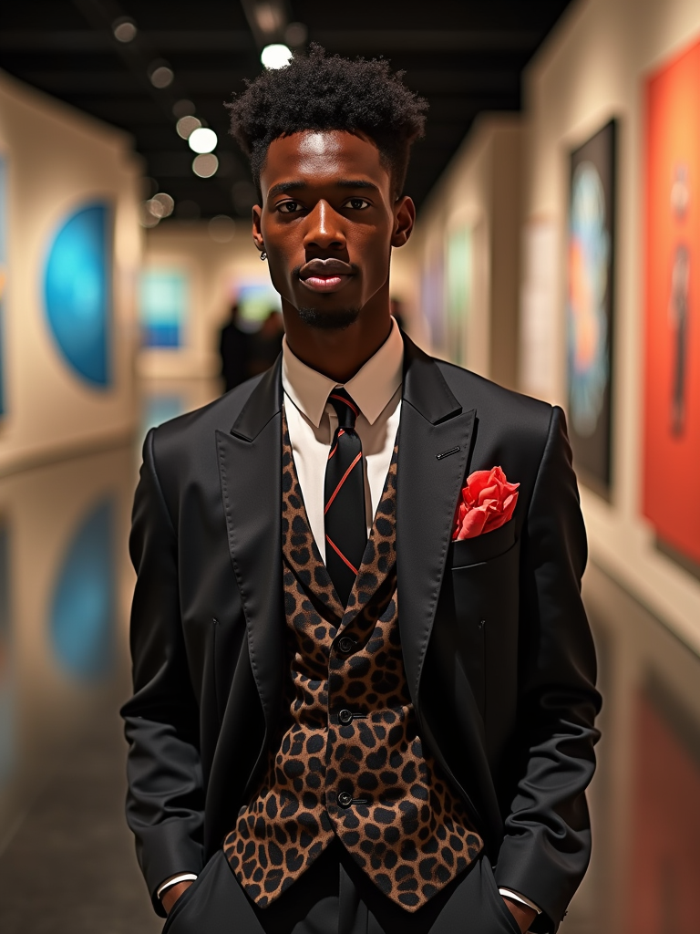 model in the themed exhibition space specially opened for the Met Gala, wearing a forward-thinking formal look with innovative materials, curated art displays with special event lighting