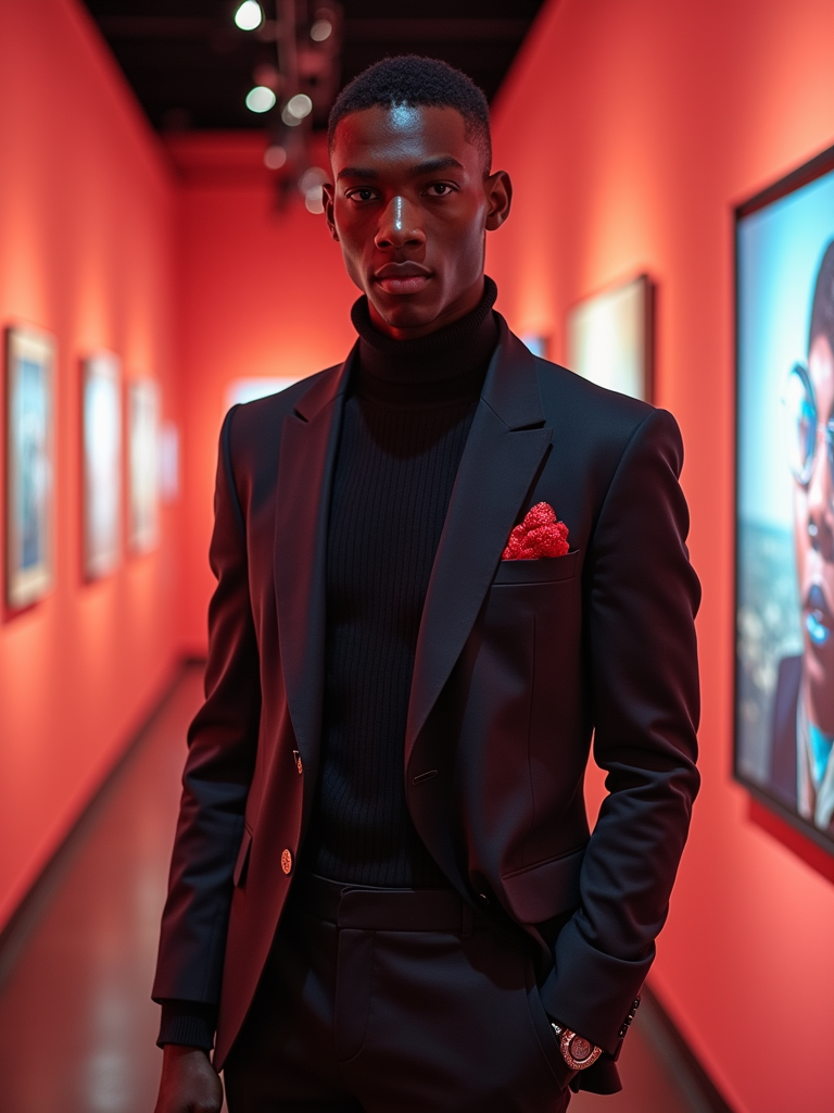 model in the themed exhibition space specially opened for the Met Gala, wearing a forward-thinking formal look with innovative materials, curated art displays with special event lighting