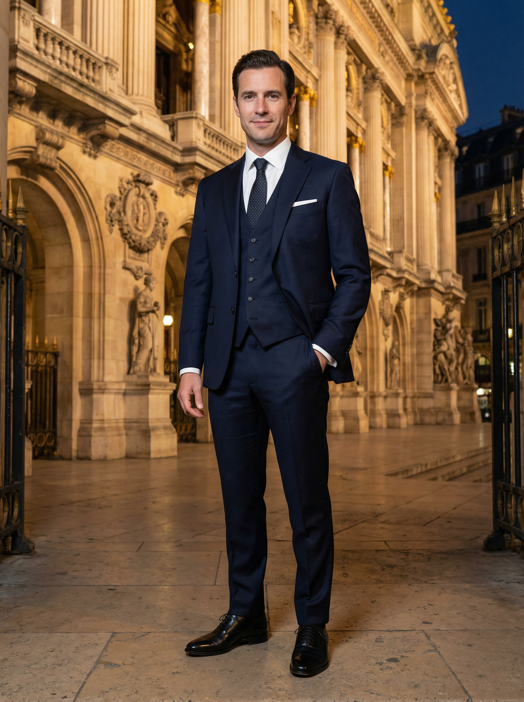 model in three-piece suit, polished shoes, pocket square at Opéra Garnier entrance, grand architectural backdrop, ornate building details, elegant evening attire, cultural sophistication, dramatic architectural lighting