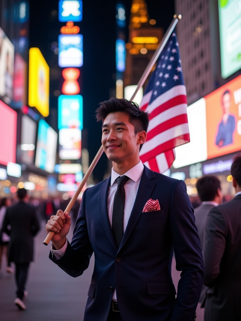 model in Times Square at night, surrounded by the iconic neon lights, wearing a stylish modern suit with American flag pocket square, waving a large American flag, the bustling energy of New York City creating an electric patriotic atmosphere