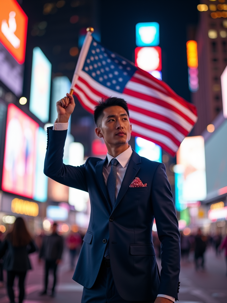 model in Times Square at night, surrounded by the iconic neon lights, wearing a stylish modern suit with American flag pocket square, waving a large American flag, the bustling energy of New York City creating an electric patriotic atmosphere