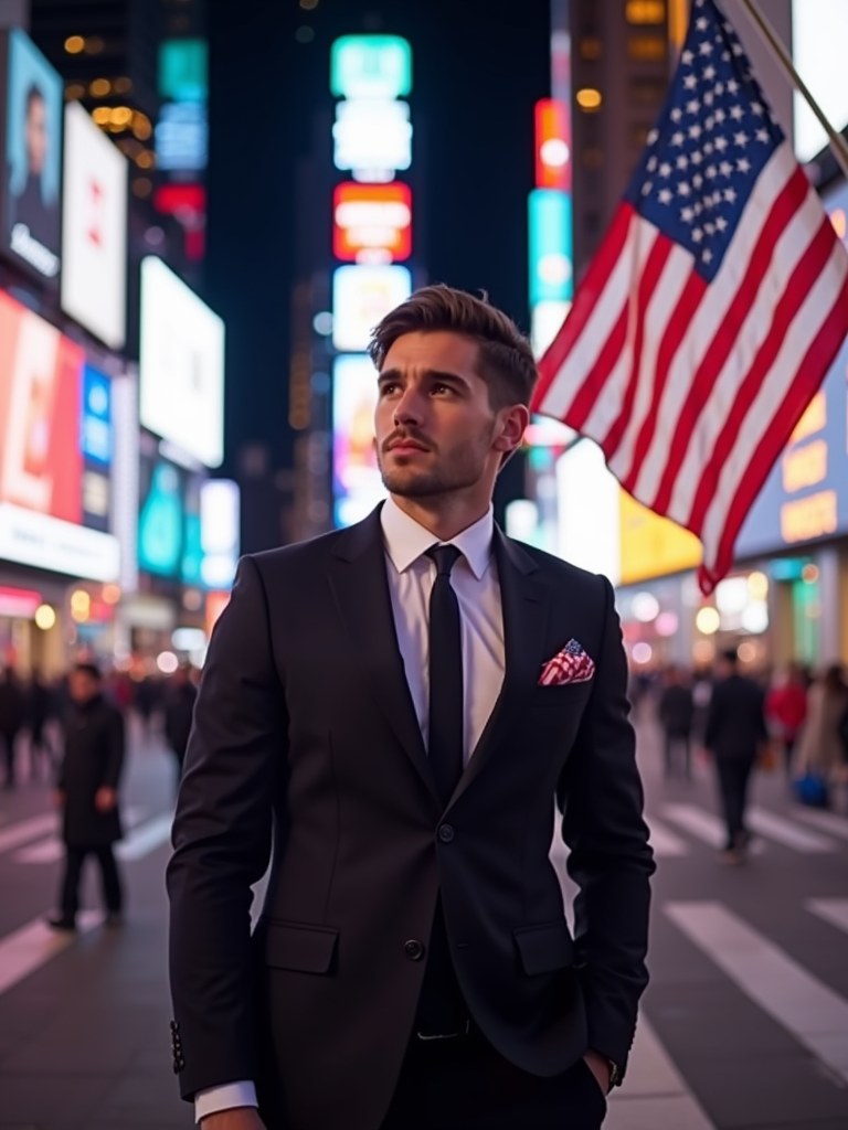 model in Times Square at night, surrounded by the iconic neon lights, wearing a stylish modern suit with American flag pocket square, waving a large American flag, the bustling energy of New York City creating an electric patriotic atmosphere