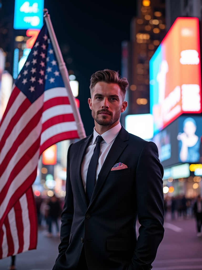 model in Times Square at night, surrounded by the iconic neon lights, wearing a stylish modern suit with American flag pocket square, waving a large American flag, the bustling energy of New York City creating an electric patriotic atmosphere