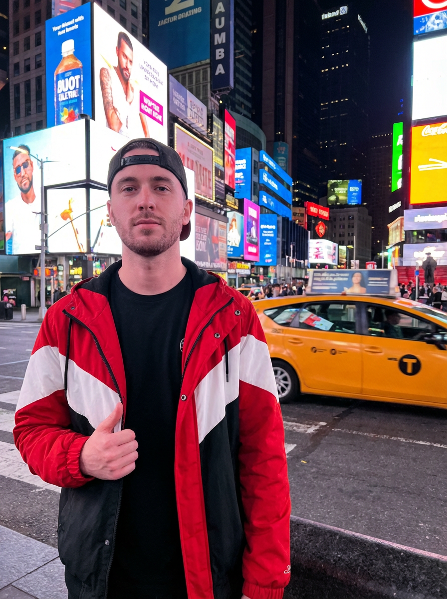 model in Times Square New York, bright billboards and lights, yellow taxi in background, stylish urban outfit, night scene
