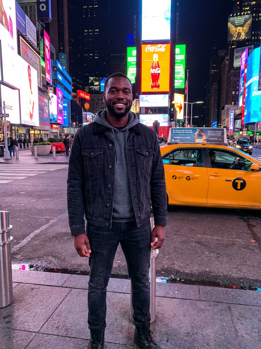 model in Times Square New York, bright billboards and lights, yellow taxi in background, stylish urban outfit, night scene
