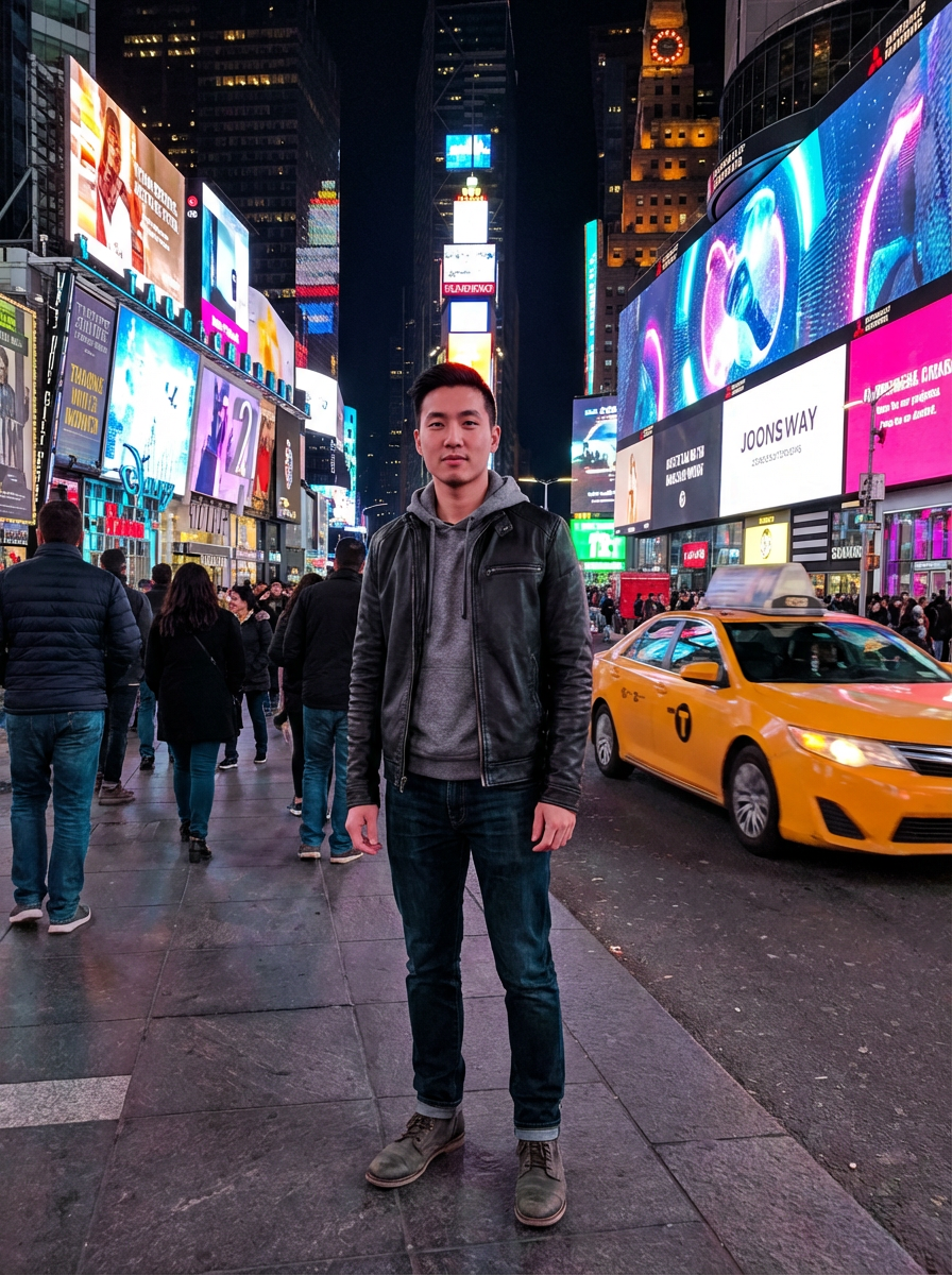model in Times Square New York, bright billboards and lights, yellow taxi in background, stylish urban outfit, night scene