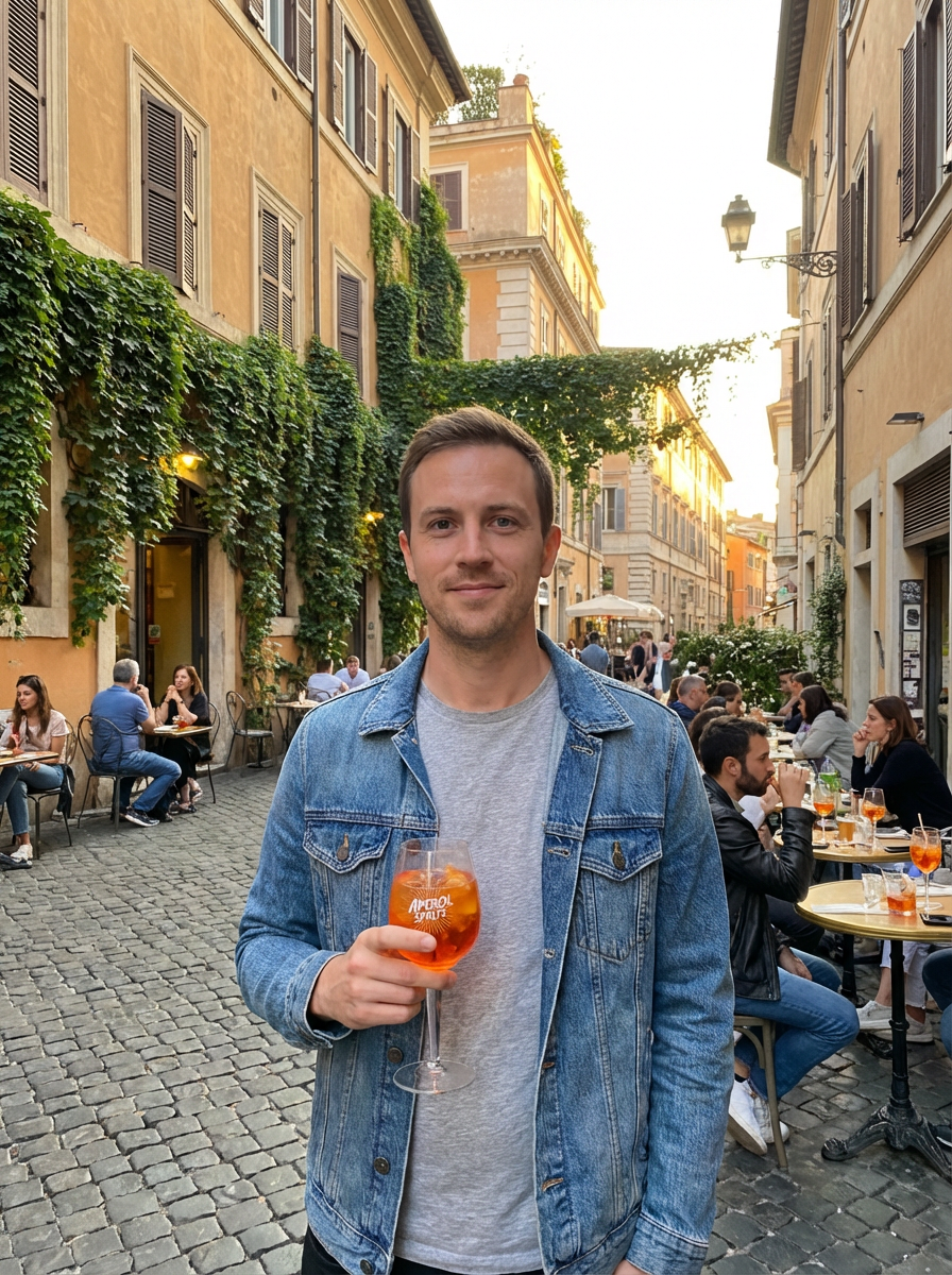 model in Trastevere neighborhood, charming cobblestone streets, ivy-covered walls, aperitivo scene