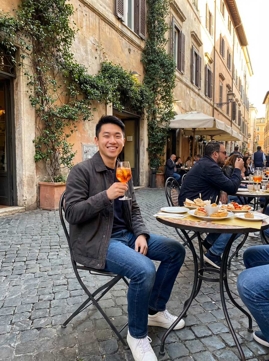 model in Trastevere neighborhood, charming cobblestone streets, ivy-covered walls, aperitivo scene