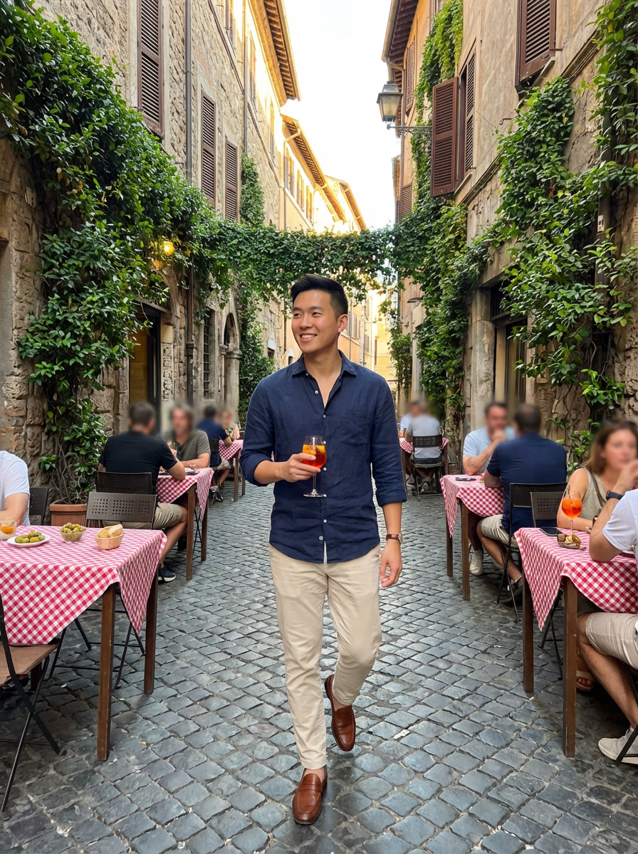 model in Trastevere neighborhood, charming cobblestone streets, ivy-covered walls, aperitivo scene