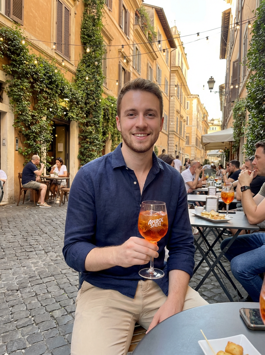 model in Trastevere neighborhood, charming cobblestone streets, ivy-covered walls, aperitivo scene