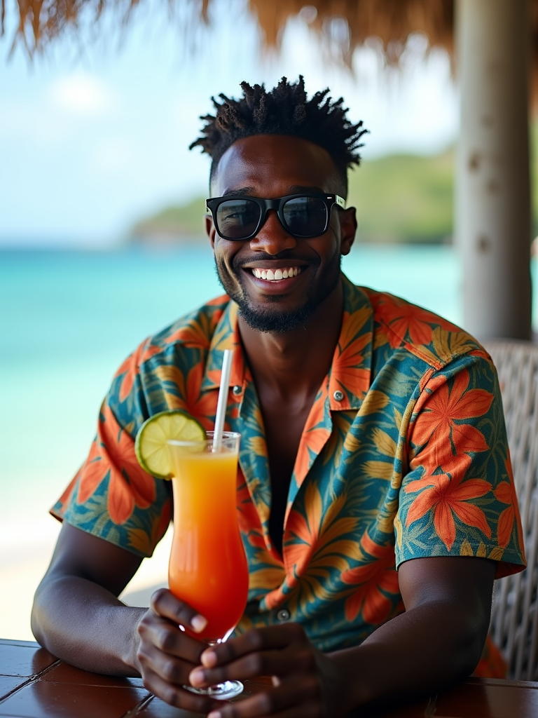 model in tropical print shirt sitting at luxury beach club in Canggu with ocean view, holding tropical cocktail