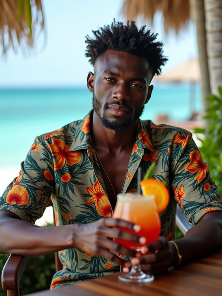 model in tropical print shirt sitting at luxury beach club in Canggu with ocean view, holding tropical cocktail