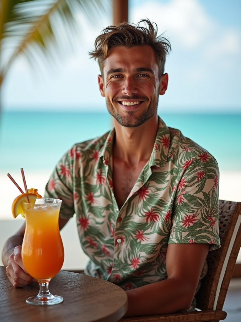 model in tropical print shirt sitting at luxury beach club in Canggu with ocean view, holding tropical cocktail