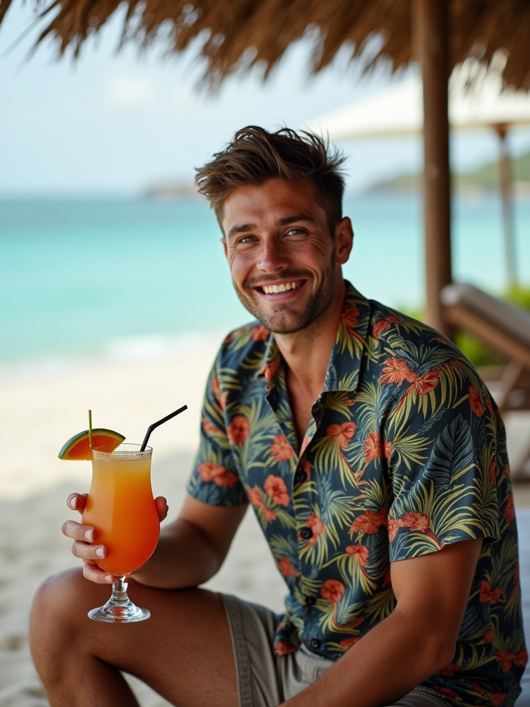 model in tropical print shirt sitting at luxury beach club in Canggu with ocean view, holding tropical cocktail