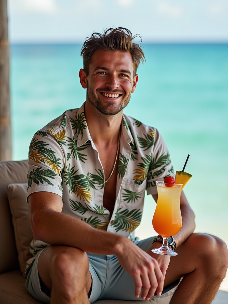 model in tropical print shirt sitting at luxury beach club in Canggu with ocean view, holding tropical cocktail