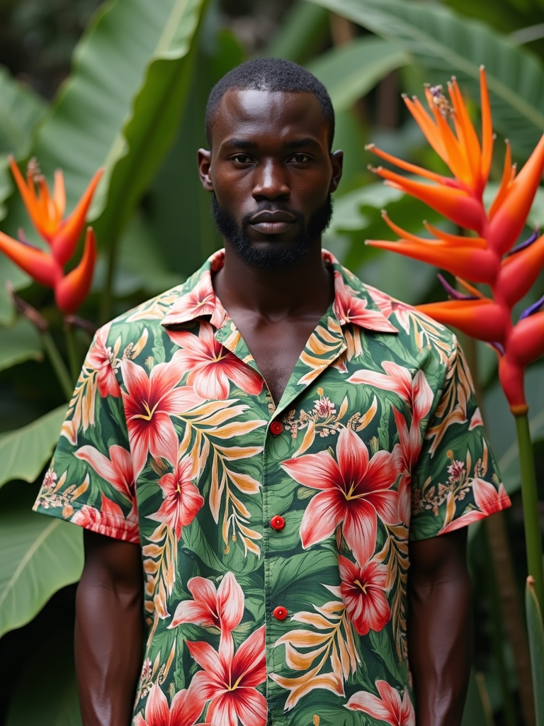 model in tropical print shirt surrounded by exotic flowers in botanical garden setting