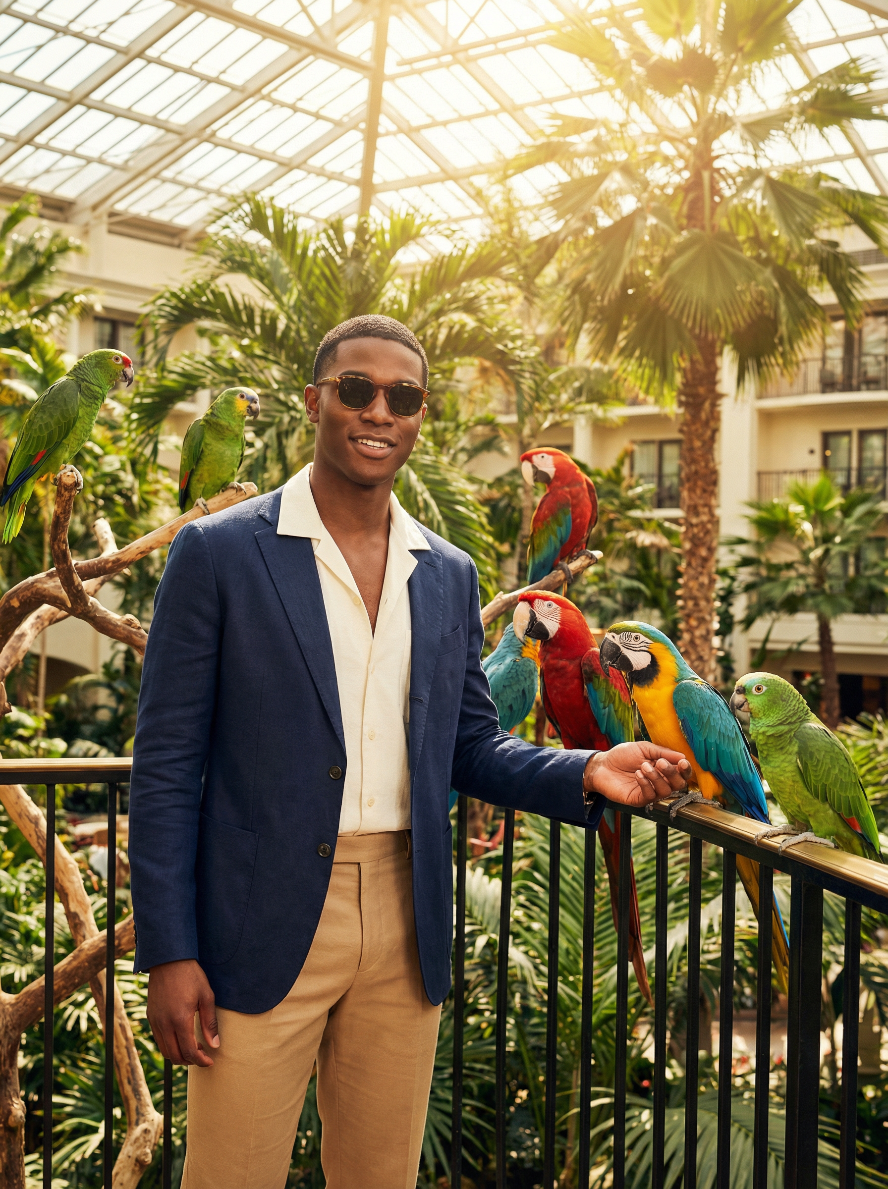 model in tropical tailoring: lightweight suit jacket, open-collar shirt, tailored pants, sunglasses in a lush luxury resort atrium with palms and warm sunbeams, 15 colorful parrots perched on railings and nearby branches around the model, vibrant but elegant editorial color, cinematic realism, crisp focus