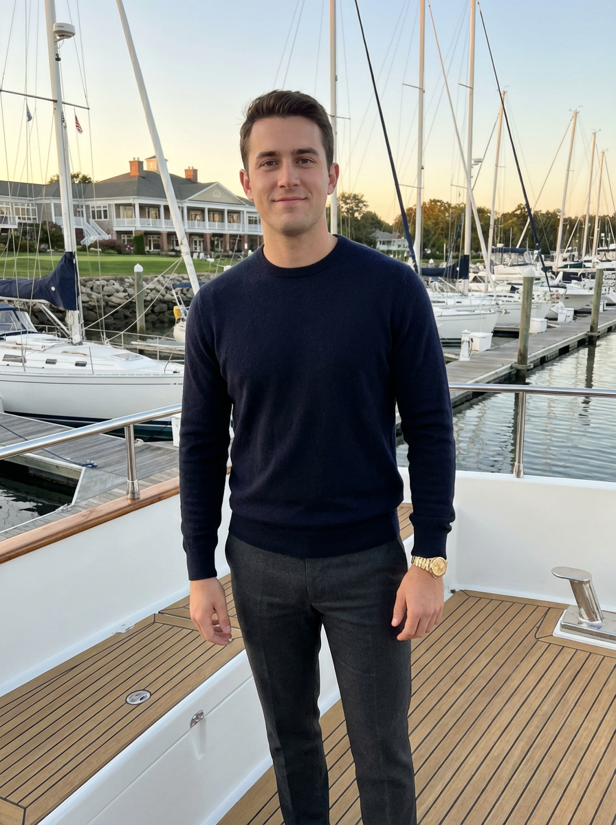 model in understated elegant attire, navy cashmere, gold watch only accessory, yacht or country club background