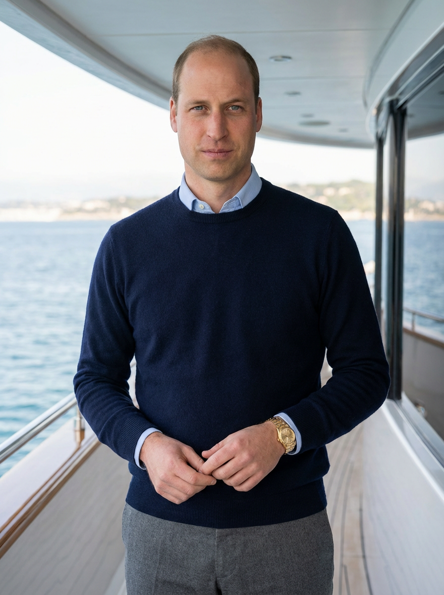 model in understated elegant attire, navy cashmere, gold watch only accessory, yacht or country club background