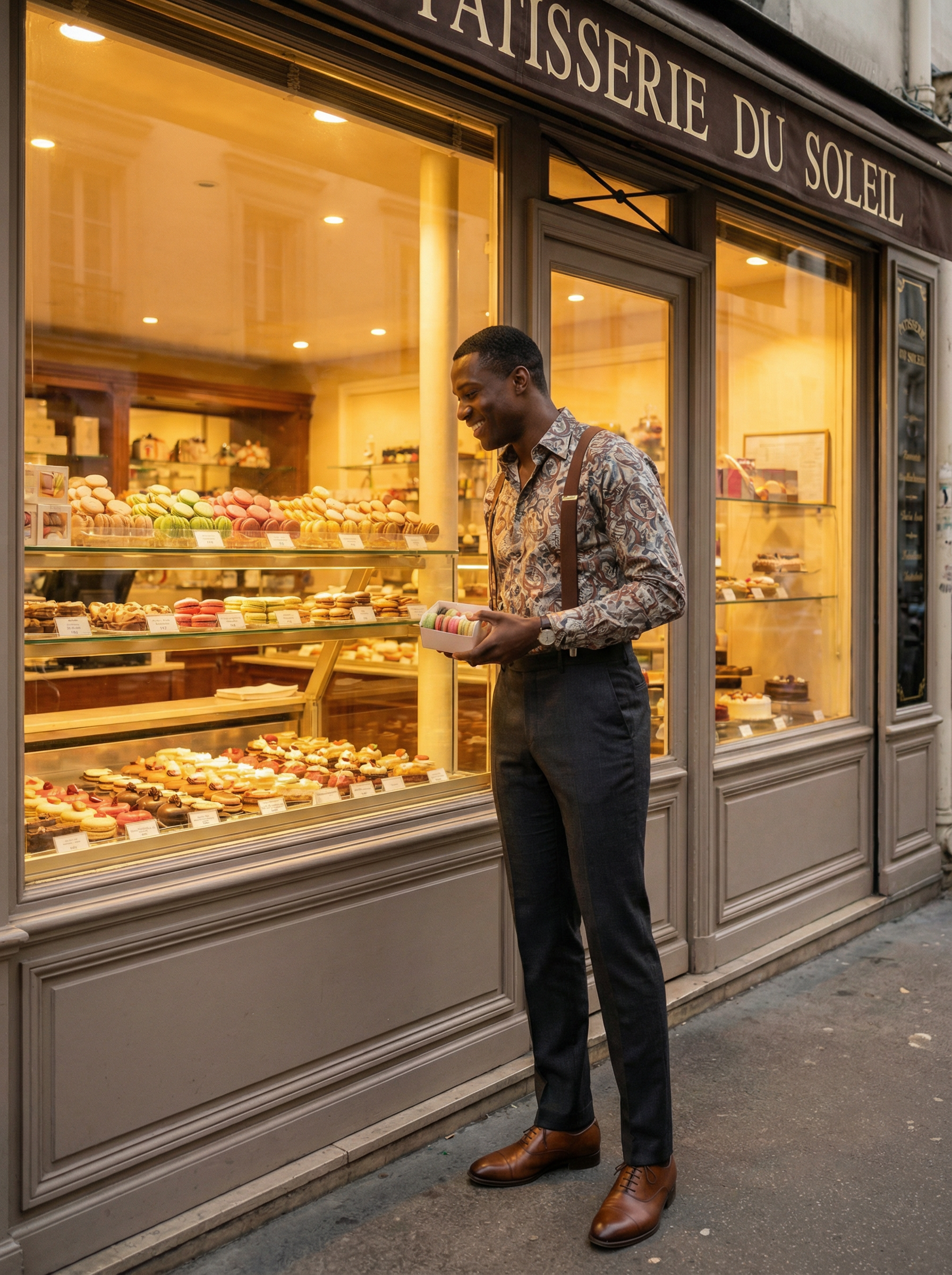model in vintage shirt, suspenders, dress pants, oxford shoes at traditional patisserie window display, colorful macarons and pastries, charming bakery setting, sweet Parisian indulgence, warm bakery lighting, culinary culture