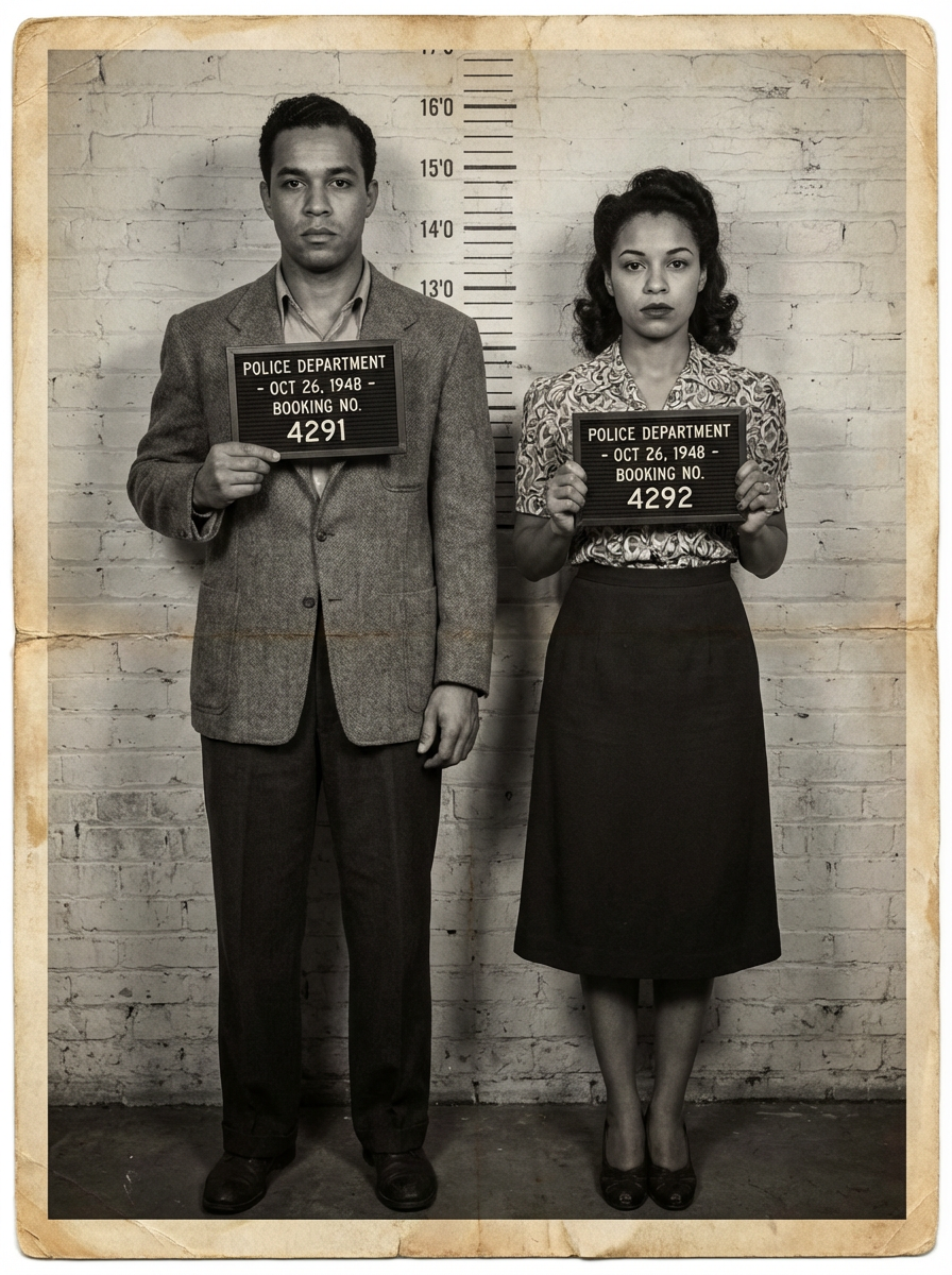 model in vintage style mugshot, black and white aesthetic, old fashioned booking photo, serious demeanor